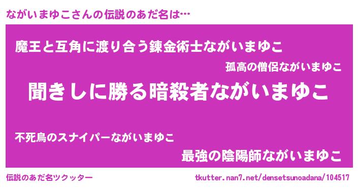 | 女子向けラノベタイトル風あだ名 | 『ながいまゆこが死なない童話 林檎のながいまゆこの診療簿』 |