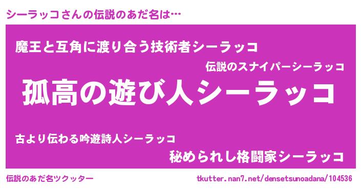 | 男性向けラノベタイトル風あだ名 | 『魔弾の王とシーラッコ』 |