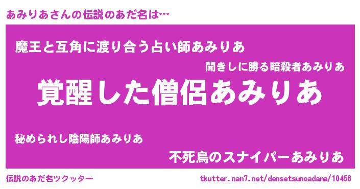 | 男性向けラノベタイトル風あだ名 | 『あみりあの嫁は女の子じゃないと思った?』 |