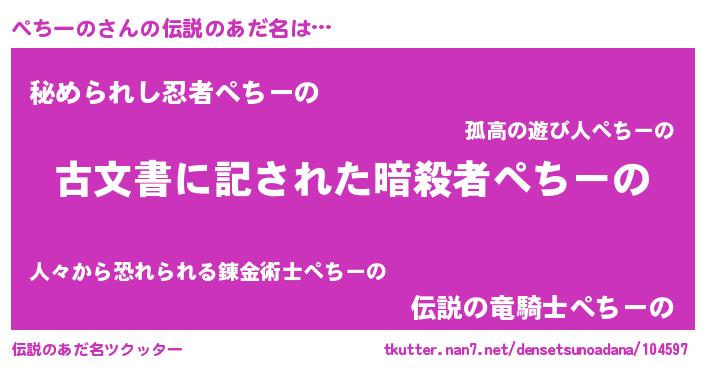 | 男性向けラノベタイトル風あだ名 | 『ぺちーの~年齢イコール彼女いない歴の魔法使い~』 |