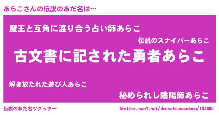 | ヒーロー風カッコイイあだ名 | 『ネオアラコ』『愛の使者あらこ』 |