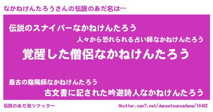 | 男性向けラノベタイトル風あだ名 | 『なかねけんたろう~年齢イコール彼女いない歴の魔法使い~』 |