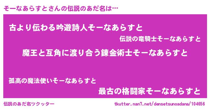 | 男性向けラノベタイトル風あだ名 | 『そーなあらすとに滅ぼされるだけの簡単なお仕事です』 |