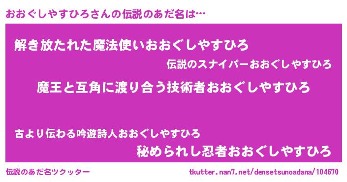 | 男性向けラノベタイトル風あだ名 | 『Re:おおぐしやすひろから始める異世界生活』 |