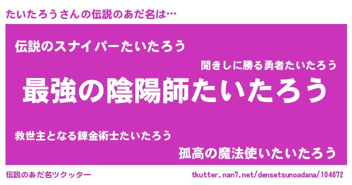 | 男性向けラノベタイトル風あだ名 | 『たいたろう~年齢イコール彼女いない歴の魔法使い~』 |