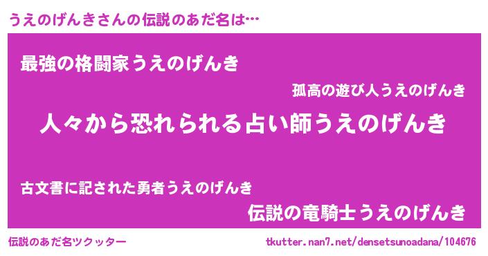 | 男性向けラノベタイトル風あだ名 | 『魔弾の王とうえのげんき』 |