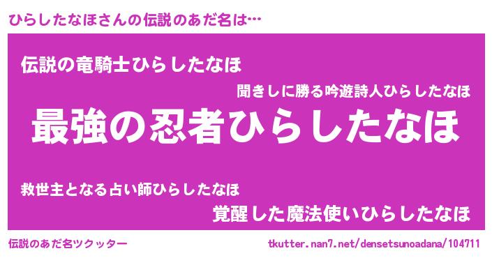 | 男性向けラノベタイトル風あだ名 | 『この素晴らしい世界にひらしたなほを!』 |
