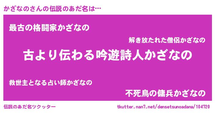 | ヒーロー風カッコイイあだ名 | 『ネオカザナノ』『ウルトラかざなのマン』 |