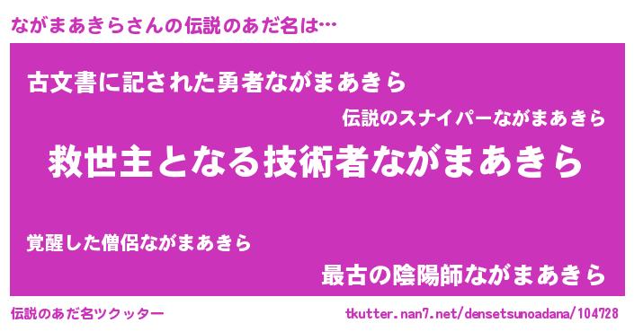 | 男性向けラノベタイトル風あだ名 | 『ながまあきらに滅ぼされるだけの簡単なお仕事です』 |