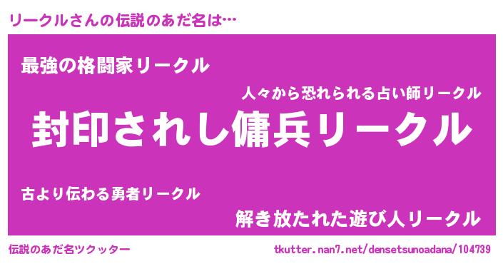 | 男性向けラノベタイトル風あだ名 | 『リークルに滅ぼされるだけの簡単なお仕事です』 |