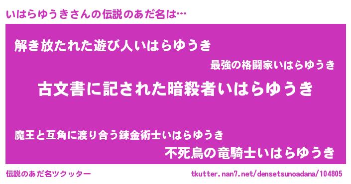 | ヘコむあだ名 | 『いはらゆうき(笑)』『いはを』 |