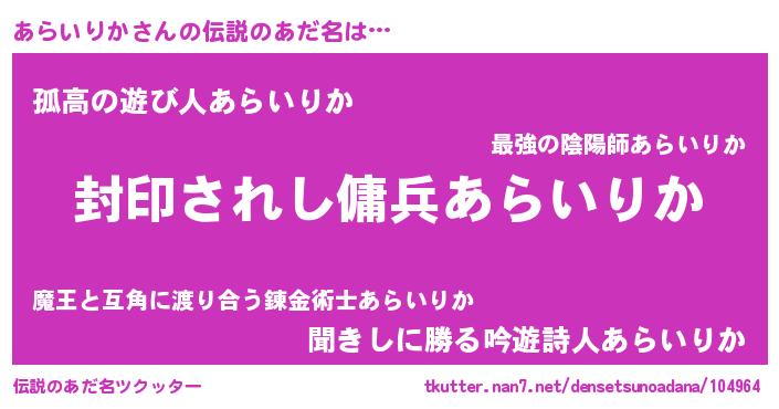 | ヒーロー風カッコイイあだ名 | 『スーパーアライリカ』『暗黒騎士アラ』 |