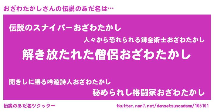 | 男性向けラノベタイトル風あだ名 | 『転生したらおざわたかしだった件』 |