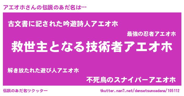 | ヒーロー風カッコイイあだ名 | 『仮面アエダー』『慈愛の使者アエオホ』 |