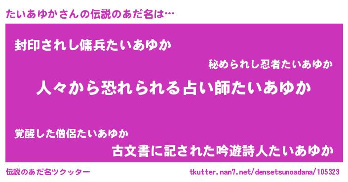 | ヘコむあだ名 | 『たいふぇ~』『たいあゆか(震え声)』 |