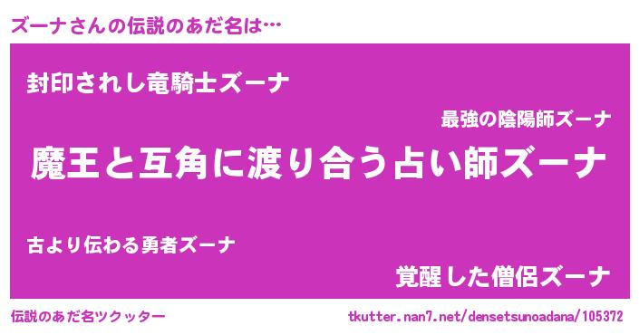 | 女子向けラノベタイトル風あだ名 | 『ズーナの玉の輿計画!』『ズーナ恋絵巻』 |
