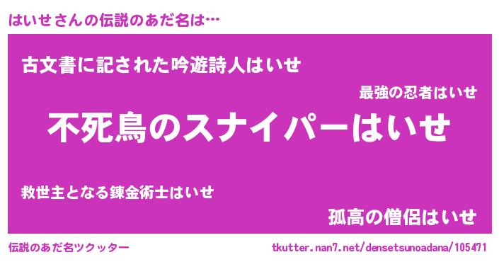 | 意味不明あだ名 | 『住所不定無職はいせ(98歳)』『自称はいせ』 |