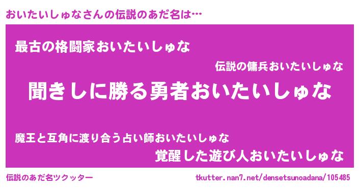 | 男性向けラノベタイトル風あだ名 | 『おいたいしゅなという概念が存在しない退屈な世界 』 |