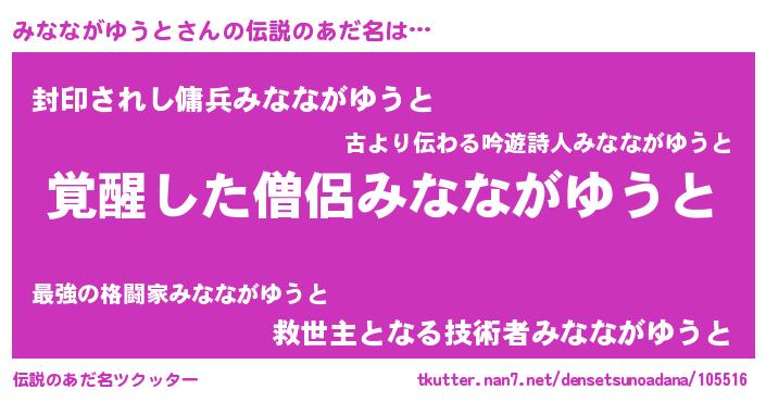 | 男性向けラノベタイトル風あだ名 | 『みなながゆうとの嫁は女の子じゃないと思った?』 |