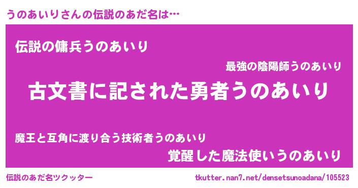 | 女子向けラノベタイトル風あだ名 | 『うのあいりストレイドッグス』 |