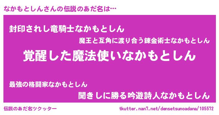 | 男性向けラノベタイトル風あだ名 | 『なかもとしん~年齢イコール彼女いない歴の魔法使い~』 |