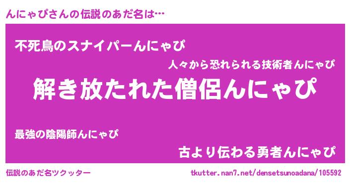 | 男性向けラノベタイトル風あだ名 | 『この素晴らしい世界にんにゃぴを!』 |