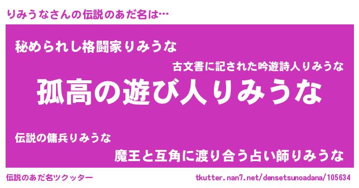 | 女子向けラノベタイトル風あだ名 | 『りみうなが死なない童話 林檎のりみうなの診療簿』 |