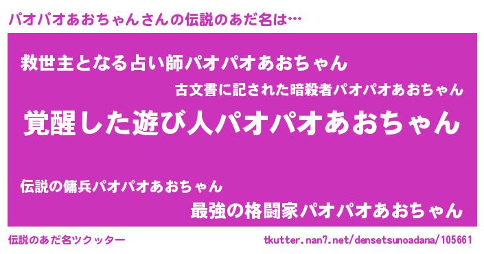 | 男性向けラノベタイトル風あだ名 | 『うちのパオパオあおちゃんが世界を掌握している!』 |