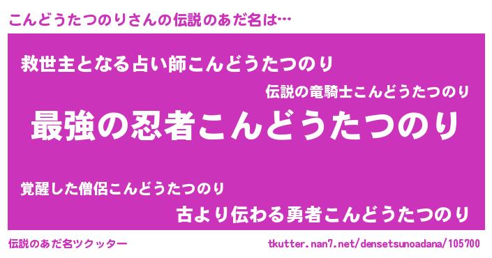 | 男性向けラノベタイトル風あだ名 | 『この素晴らしい世界にこんどうたつのりを!』 |