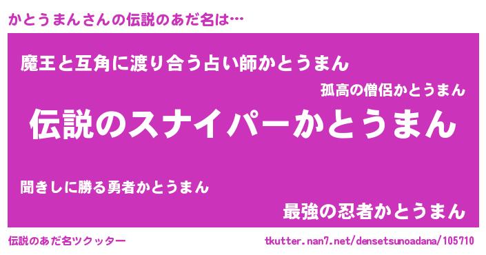 | 胡散臭い通販商品みたいなあだ名 | 『必ず成功する霊験あらたかなお札…その名も「かとうまん」』 |