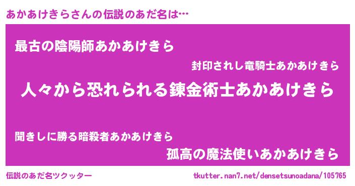 | 男性向けラノベタイトル風あだ名 | 『おまえをオタクにしてやるから、俺をあかあけきらにしてくれ! 』 |