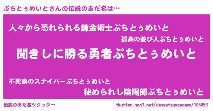 | ヘコむあだ名 | 『ぷちとぅめいと(震え声)』『牛乳』 |