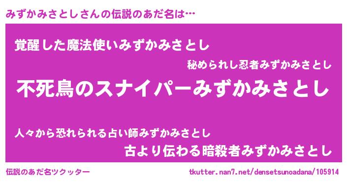 | 男性向けラノベタイトル風あだ名 | 『転生したらみずかみさとしだった件』 |