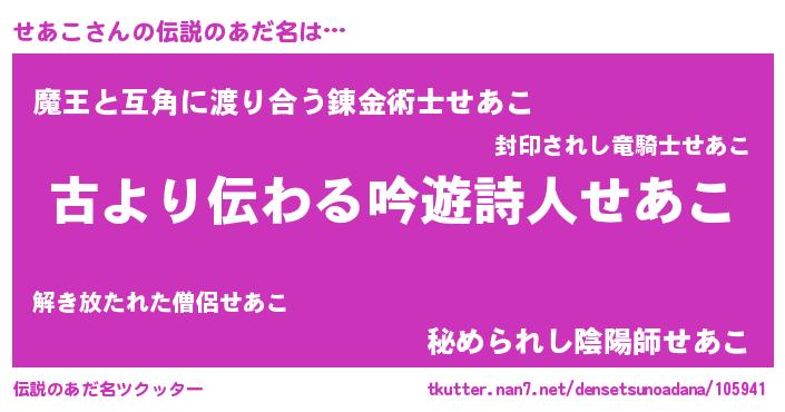 | ヒーロー風カッコイイあだ名 | 『ネオセアコ』『友情の使者せあこ』 |