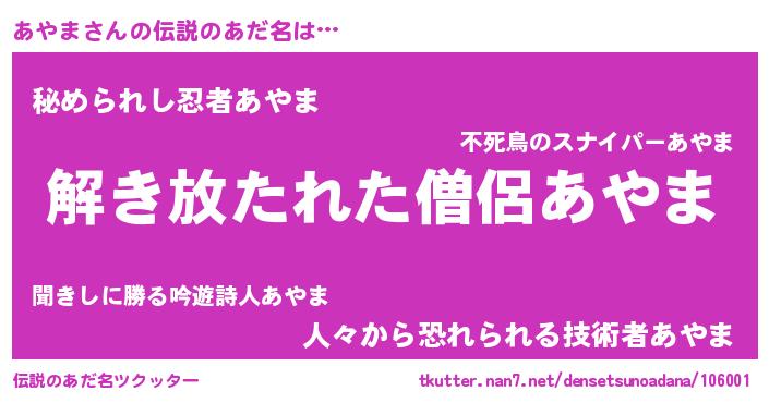 | ヒーロー風カッコイイあだ名 | 『幻影騎士アヤ』『サイバー戦士アヤマ』 |