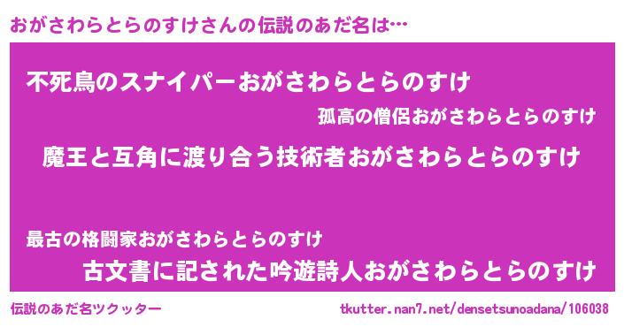 | 男性向けラノベタイトル風あだ名 | 『おまえをオタクにしてやるから、俺をおがさわらとらのすけにしてくれ! 』 |