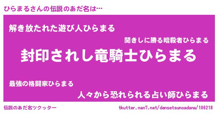 | 男性向けラノベタイトル風あだ名 | 『Re:ひらまるから始める異世界生活』 |