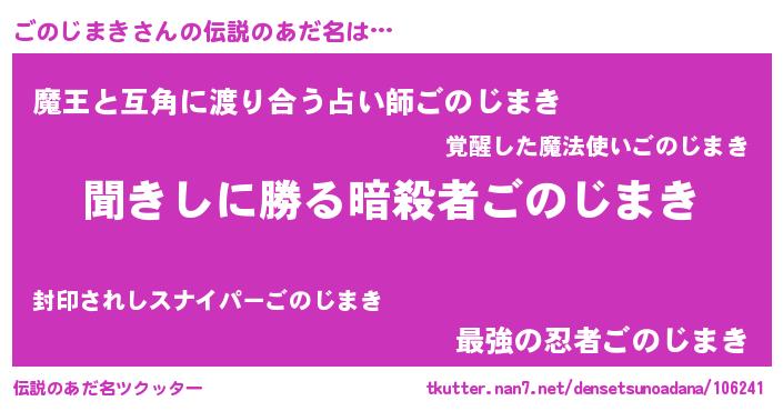 | 男性向けラノベタイトル風あだ名 | 『魔弾の王とごのじまき』 |