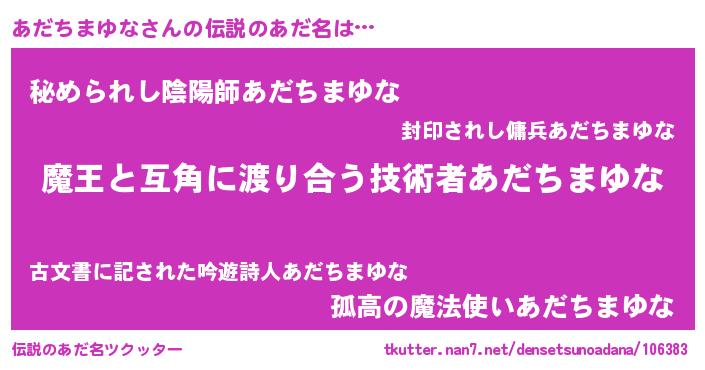 | 女子向けラノベタイトル風あだ名 | 『シンデレラあだちまゆな家の靴箱館』 |