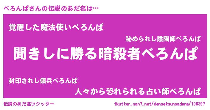 | 男性向けラノベタイトル風あだ名 | 『魔弾の王とべろんぱ』 |