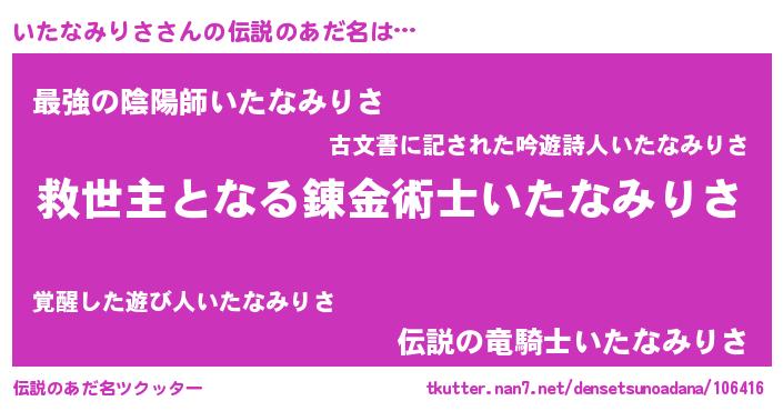 | 意味不明あだ名 | 『住所不定無職いたなみりさ(85歳)』 |