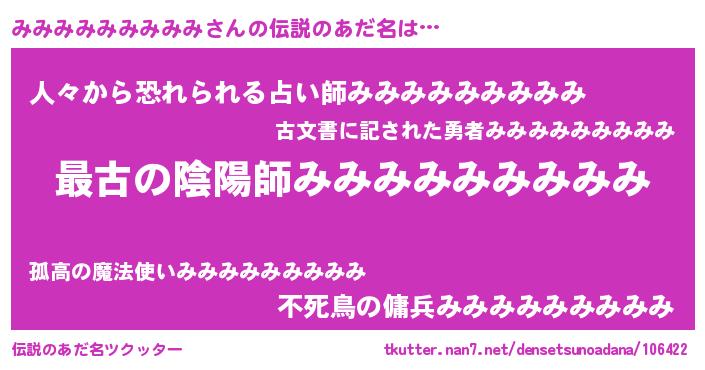 | 男性向けラノベタイトル風あだ名 | 『魔弾の王とみみみみみみみみみ』 |
