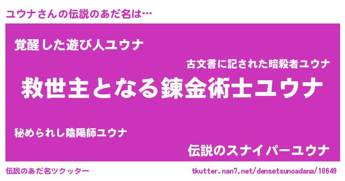 | 男性向けラノベタイトル風あだ名 | 『Re:ユウナから始める異世界生活』 |