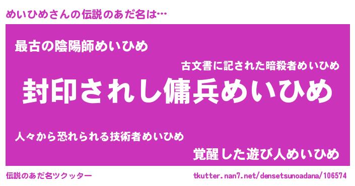 | ヒーロー風カッコイイあだ名 | 『究極戦士メイヒメ』『スーパーメイヒメ』 |