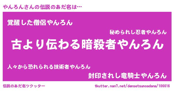 | 女子向けラノベタイトル風あだ名 | 『乙女ゲームの破滅フラグしかない悪役やんろんに転生してしまった…』 |