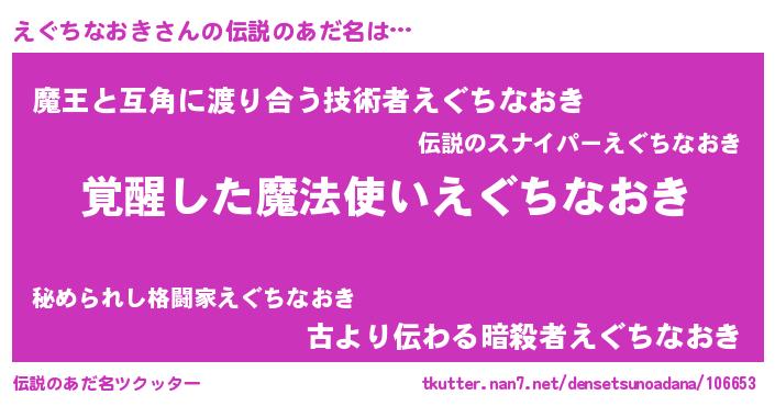 | ヒーロー風カッコイイあだ名 | 『炎刃騎士エグ』『愛の使者えぐちなおき』 |