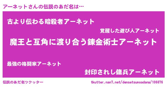 | 女子向けラノベタイトル風あだ名 | 『アーネット恋絵巻』『闇のアーネット』 |