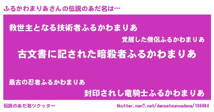 | 男性向けラノベタイトル風あだ名 | 『ふるかわまりあ~年齢イコール彼女いない歴の魔法使い~』 |