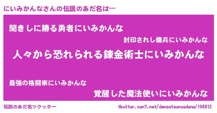 | 男性向けラノベタイトル風あだ名 | 『おまえをオタクにしてやるから、俺をにいみかんなにしてくれ! 』 |
