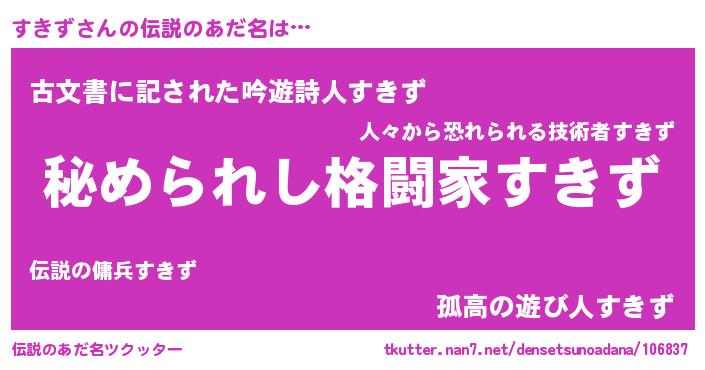| 男性向けラノベタイトル風あだ名 | 『スキズスレイヤー』『魔弾の王とすきず』 |